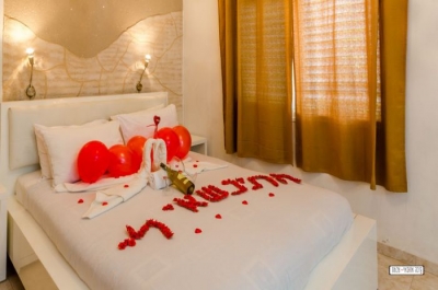 צימר פלוטו עם מיטת מים ובולמי זעזועים, ג'קוזי עגול ענק, ונגיעות יוקרה בכל מקום.